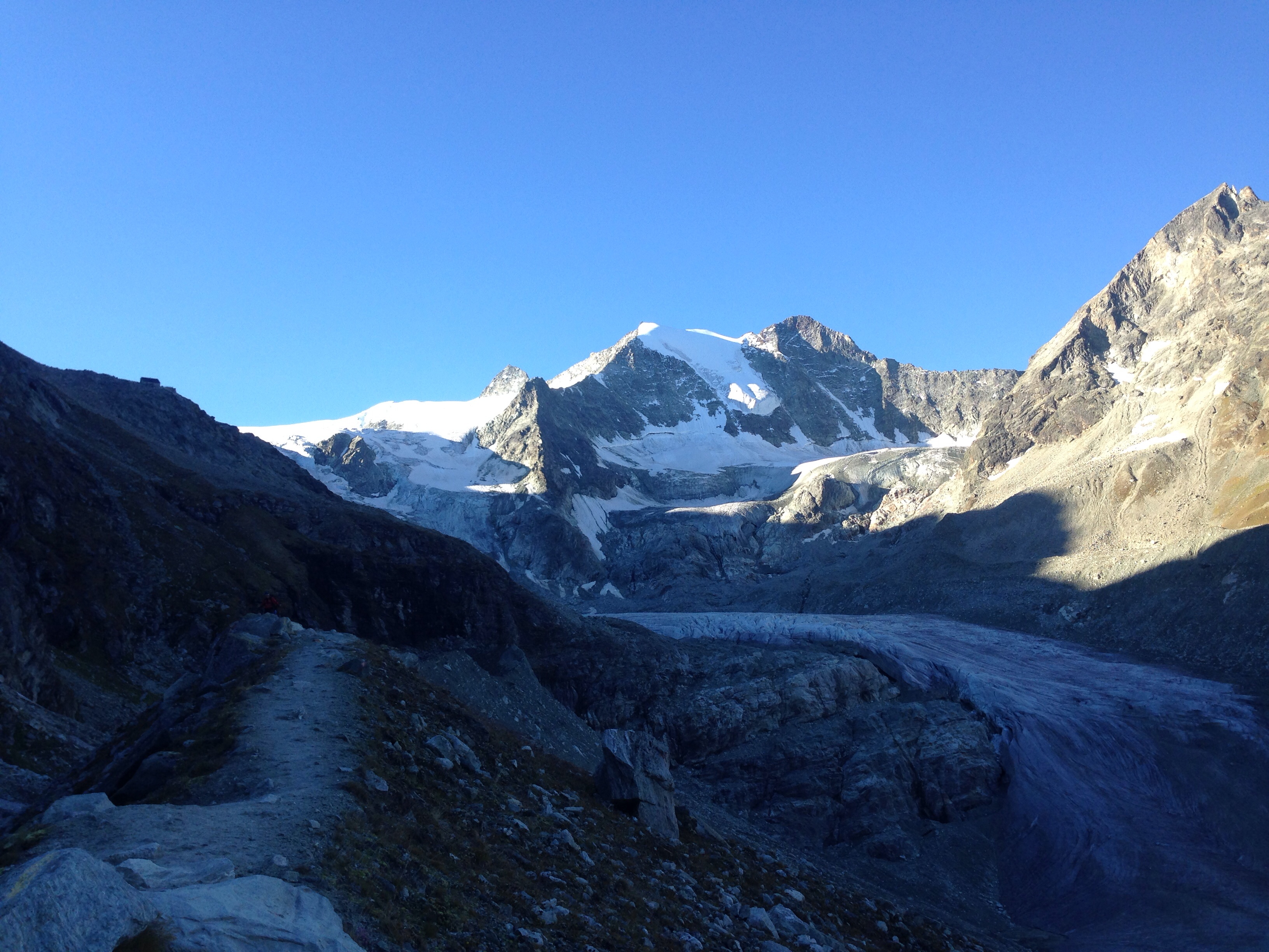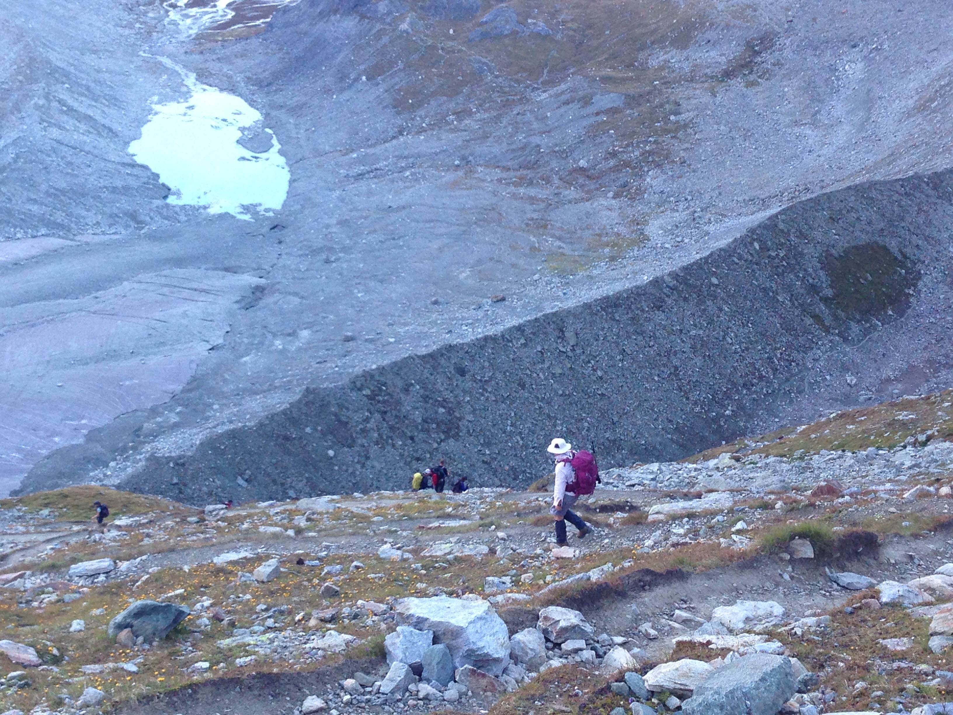 The hike out of Cabane de Moiry was a little scary for me first up – it was the zigzag in reverse – weirdly I felt better going up than facing down hill on those corners. There were some groups of about 10 leaving at around the same time as us so any chance of serenity while hiking down beside the glacier was gone. I did however enjoy the guide’s stories about how much Australians love to party – he was recounting a fire alarm experience from when he last visited Sydney. He was clueless he had two Aussies in front of him!