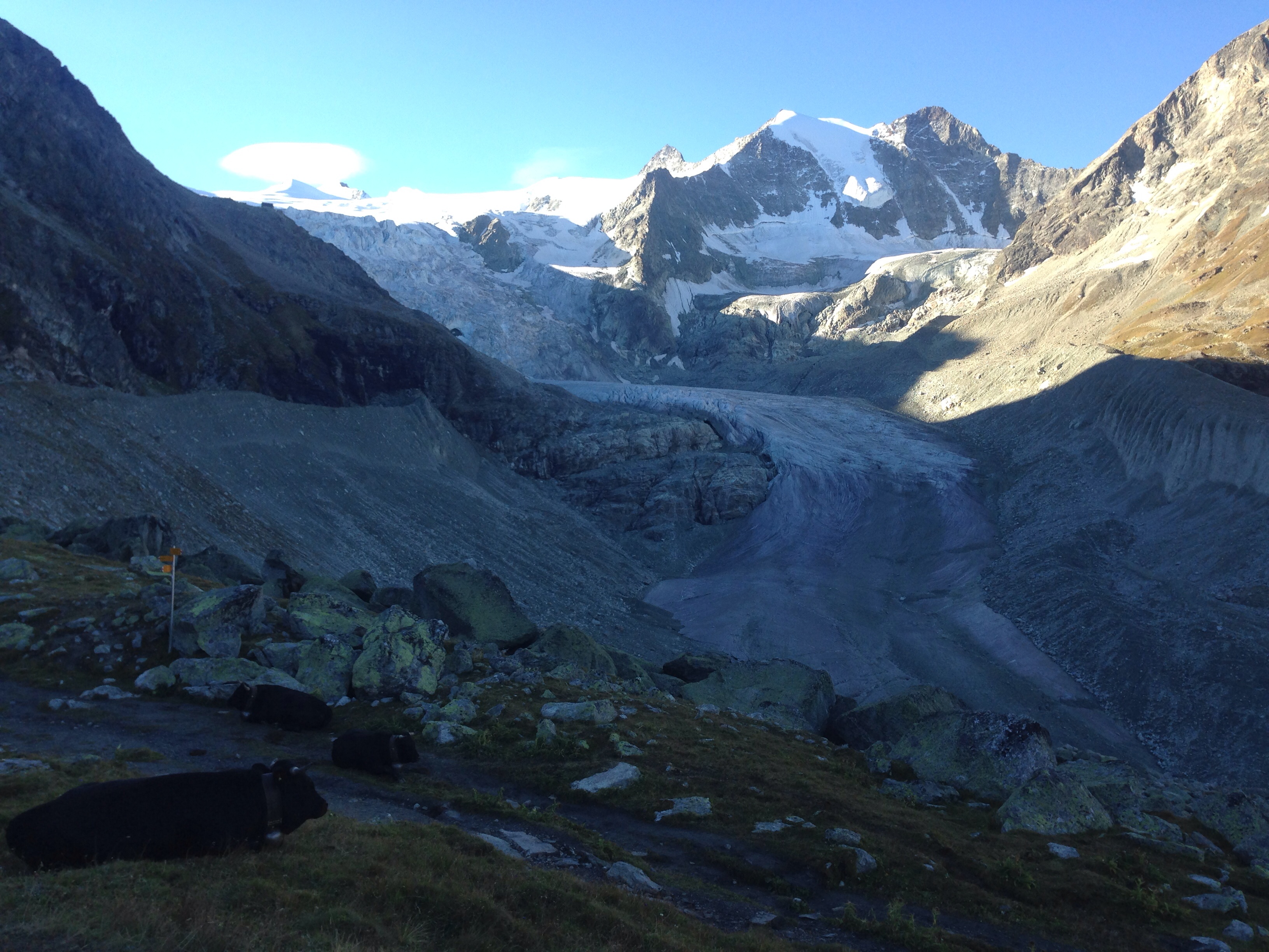 The walk across towards the col was spectacular with the Lac de Moiry coming into view after not too long. The clouds were pretty spectacular that day. We felt a bit bad bumping into some amorous cows!